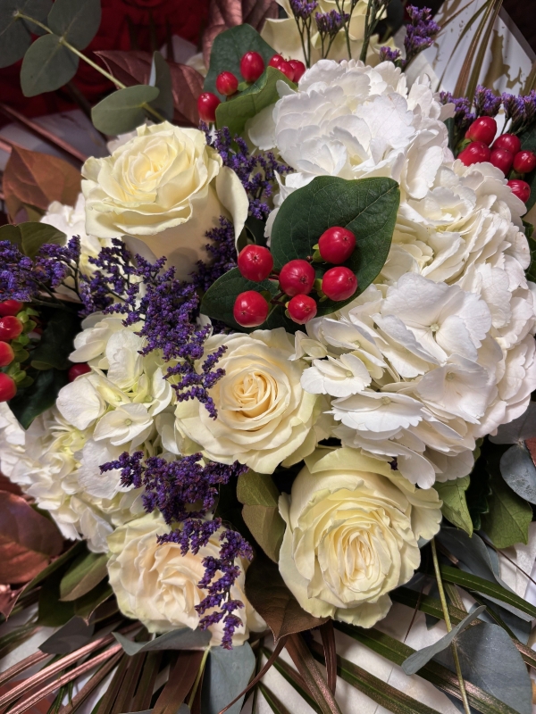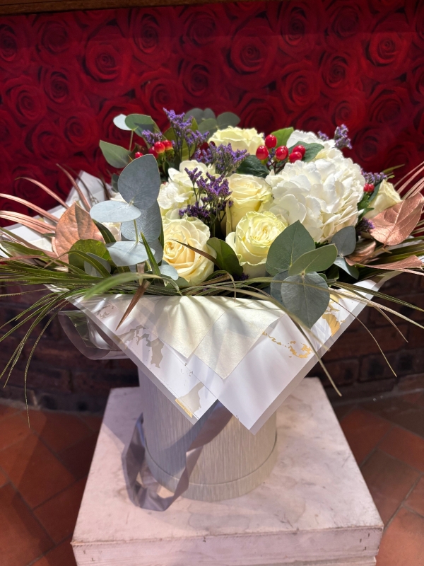 This arrangement features white roses, hydrangeas, limonium, eucalyptus and pops of red hypericum finished off with copper sprayed foliage. Handtied in a bubble of water and placed in an elegant hat box