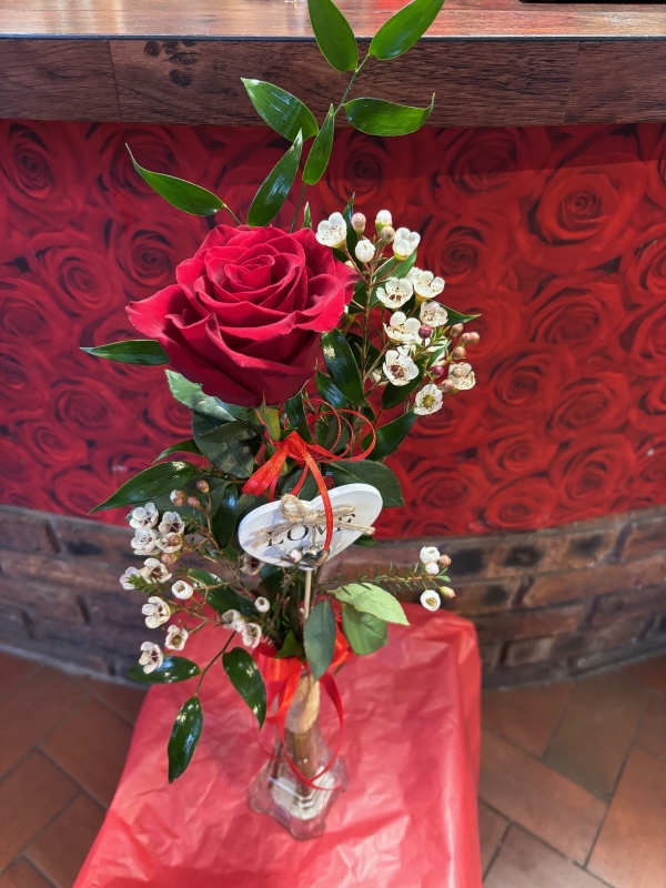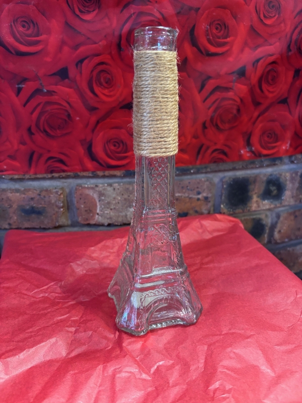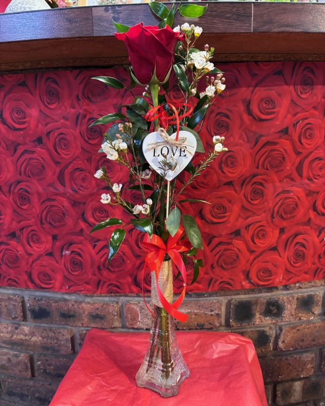 A tall, large headed premium explorer rose, complimented with french ruscus, wax flower and a loveheart 'love' pick all placed into an Eiffel tower vase. Parfait!!