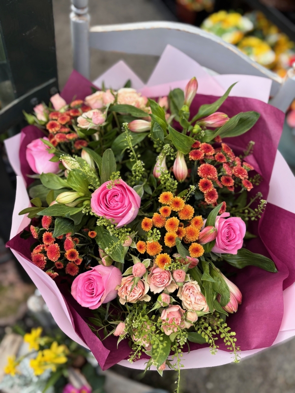 A striking bouquet in pink and peach tones featuring roses. Hand-tied, gift wrapped and delivered in water.